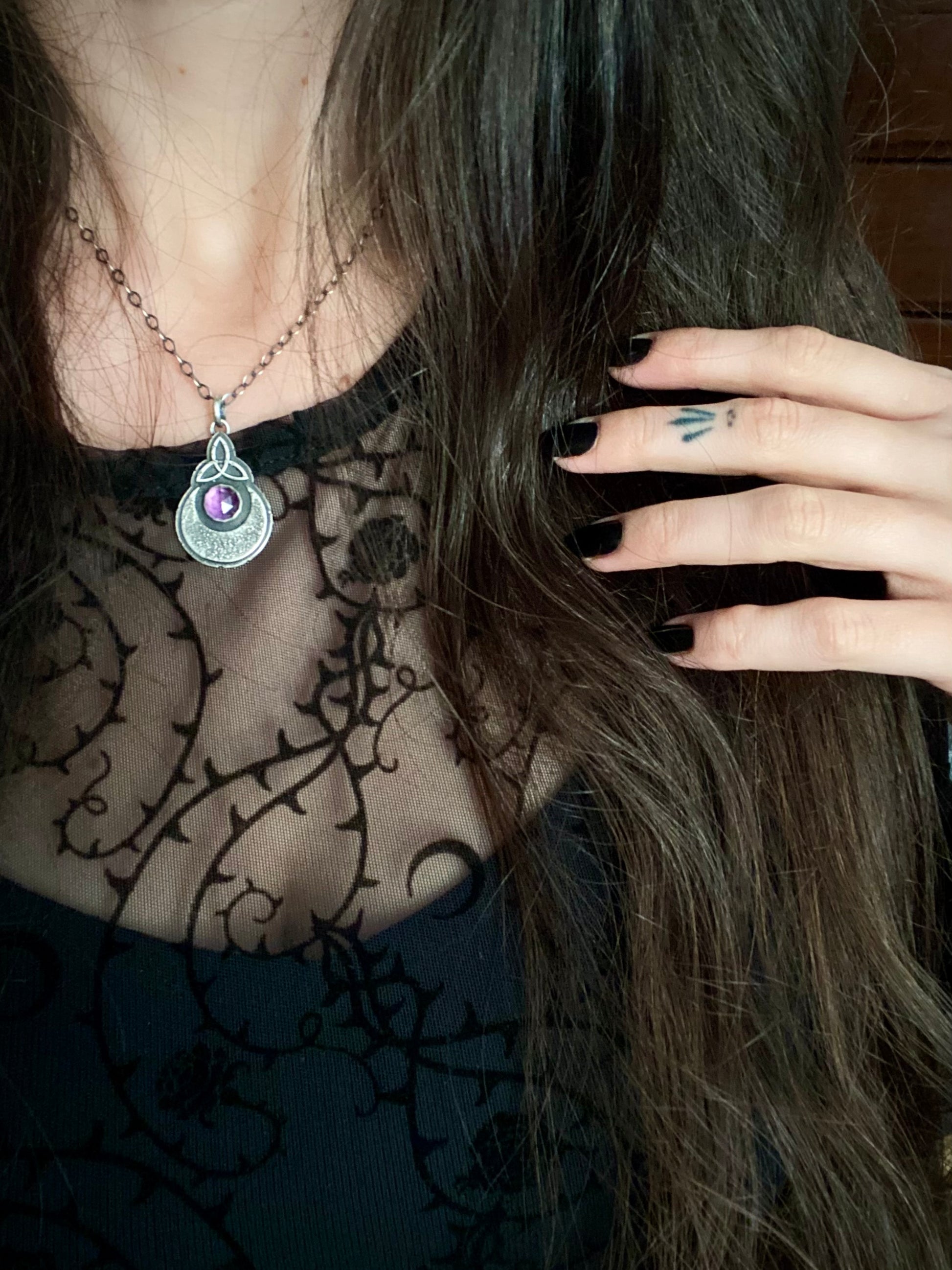 These Bandraoi Pendants were crafted as an ode to ancient Druid magic, to the endless quest to piece together the fragments of what we know from that time, and to the lost secrets we’ll never uncover. Weathered triquetra knots represent the ancestral energy that flows through each of us and the eternal interconnectedness of all things. Textured upturned crescent moons float below the Celtic knots, granting their lunar protection and guidance through the darkness. These pendants are intended as talismans for times of renewal and transformation, and as reminders of the ancient magic that lives within us all, even when we can’t feel it. They feature round gems of amethyst, iolite, and lapis lazuli, all stones of illumination and protection, and have been stamped with my maker's mark and .925 for sterling on the back.