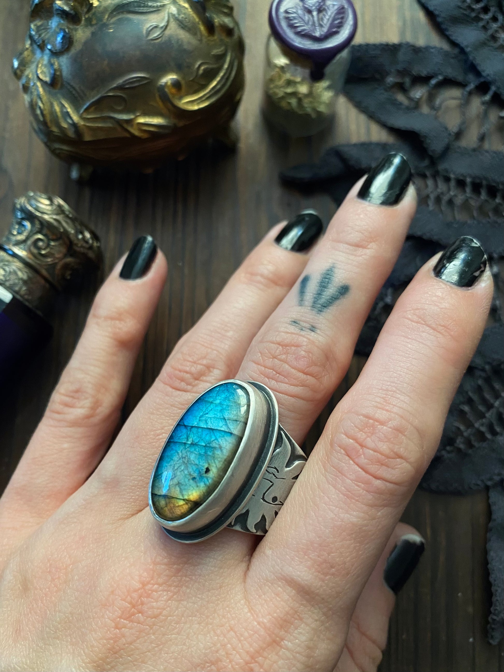 Oh, the nostalgia these rings evoke. These are my ode to the 90s witch, to the iconic style now known as whimsigoth that was birthed from that time, to the streets and shops of Salem where I spent so many formative days as a kid (and still do!), and, of course, to celestial magic. Each sterling silver ring features a wide band laden with a sun, moon, triquetra Celtic knot, stars, spirals, and swirls; they are the perfect culmination of the imagery of the Realm of the Luminaries Collection. One ring features a stunning oval of labradorite with a sunset of flash (size 11), another boasts a rosecut diamond shaped amethyst that glitters in the light (size 9 1/4), and one features a glorious Koroit Boulder Opal (size 8 1/2). These rings of illumination, transformation, and inspiration have been blackened and selectively polished to highlight the details. Each one has my maker's mark and .925 for sterling on the inside of the band.