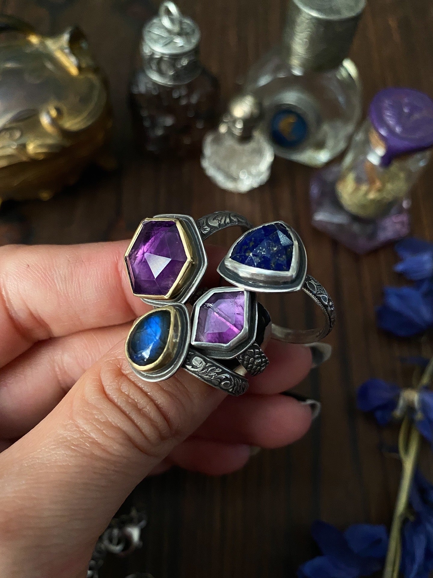 These regal jewels are meant to feel as if they were plucked from a celestial kingdom. They feature stones of protection, transformation, and inspiration. Each one has been blackened and polished to highlight the details.
