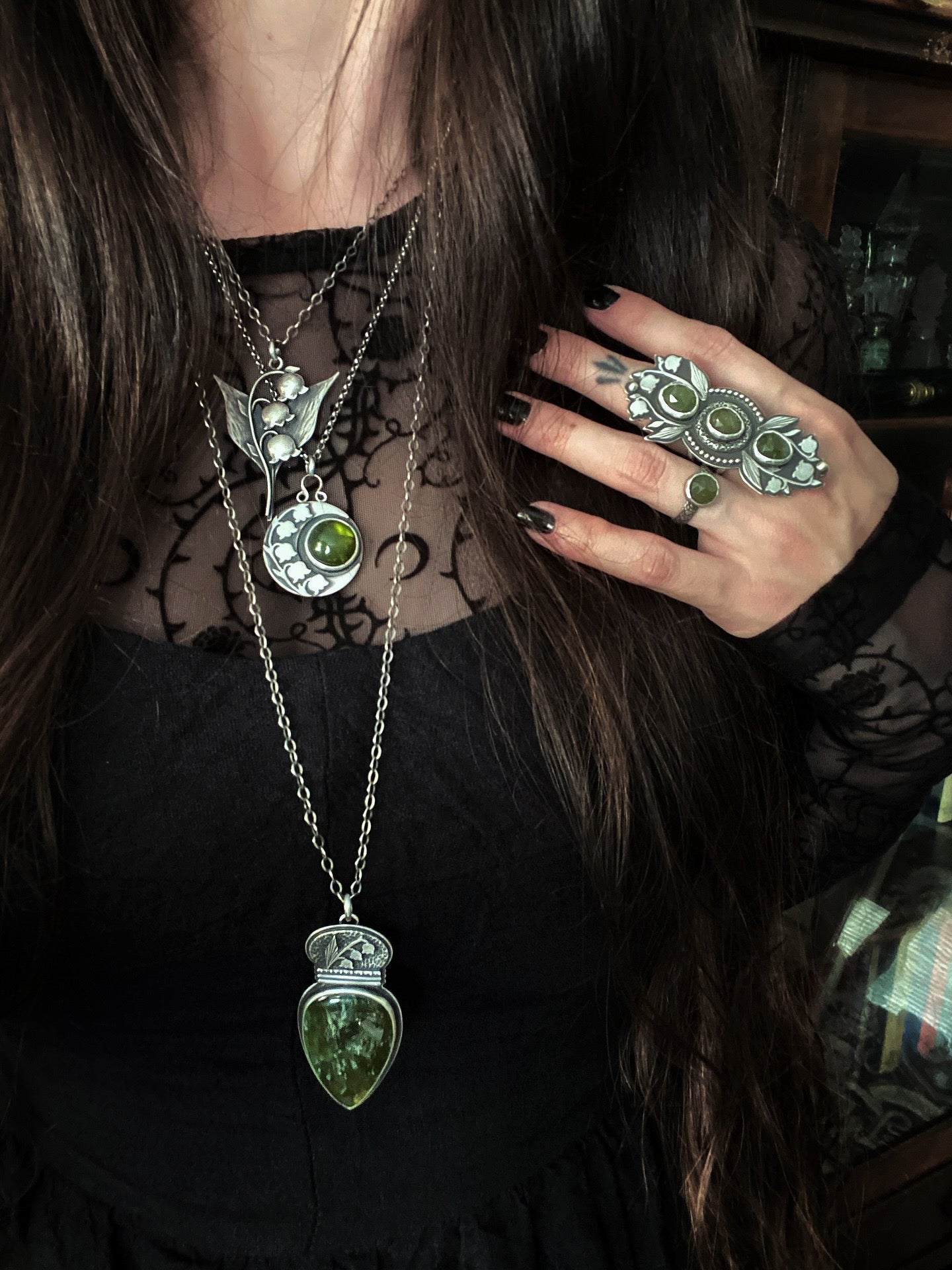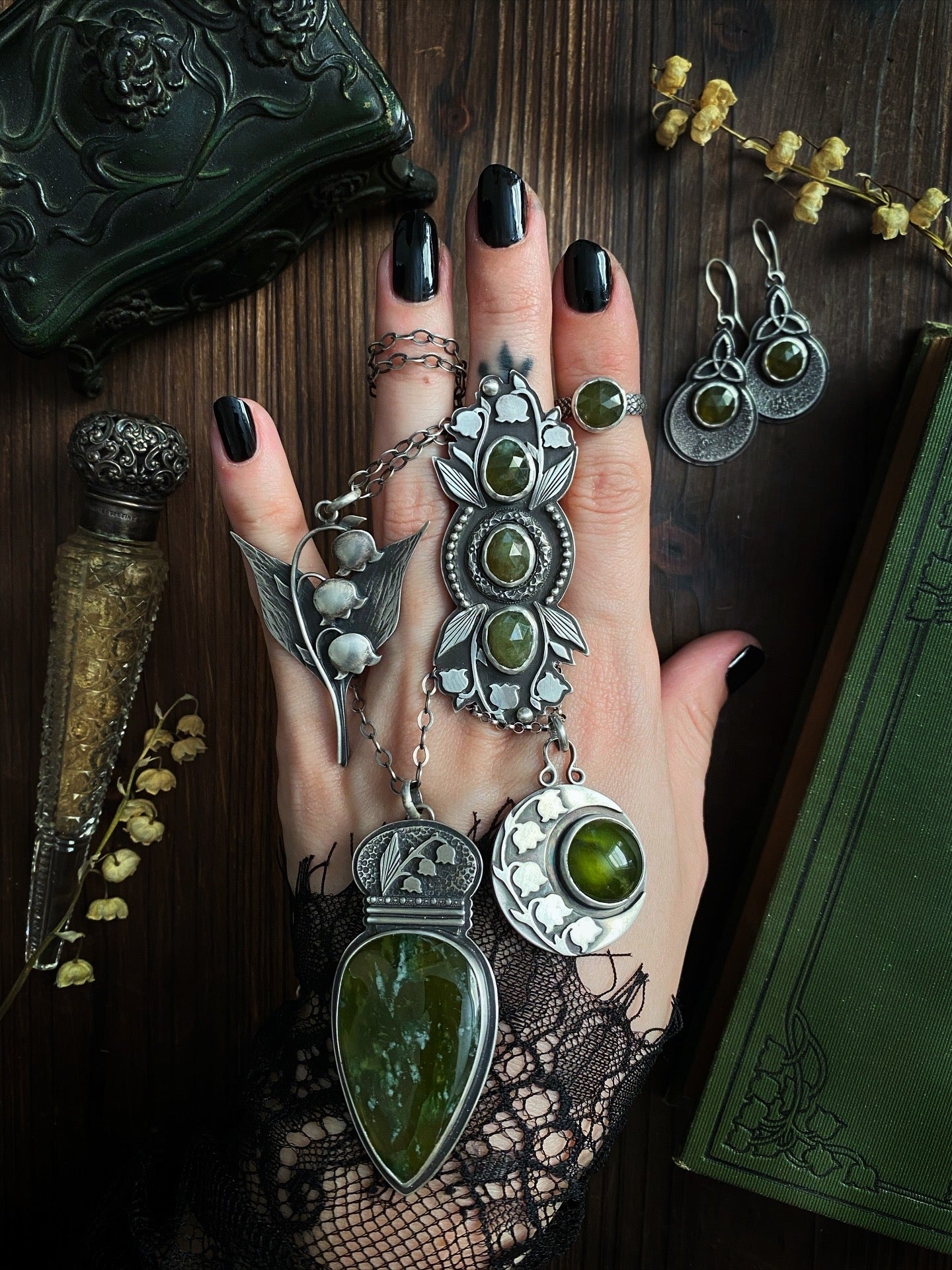 If I’ve learned anything from lily of the valley, it’s that you must protect your magic. These intriguing and alluring flowers hold a deadly secret to guard against predation: they are highly poisonous upon consumption, sometimes lethally so. This one of a kind sterling silver statement ring was inspired by the fighting spirit of these stunning little blooms. It features three thick rose cuts of sparkling & earthy vesuvianite that radiate their grounding, stabilizing, and negativity-purging energy. Handmade lily of the valley, that I sawed out from my own drawings, cradle the top and bottom stones. This boundary is echoed by ornately etched floral and beaded borders around the center stone. A diadem for the hand, a piece of armor to guide and protect you on your unique path, this ring sit atop a triple-split band. It has been blackened and polished for the vibe of an old world magical artifact. My maker's mark and .925 for sterling adorn the underside.